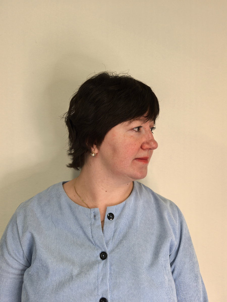 Я не стала застригать волосы сильно короче — важно было избежать ощущения «застриженности», особенно после негативного опыта. Вместо этого мы перераспределили объем, убрав лишнее в нижней зоне и создав лёгкий подъём в затылочной.