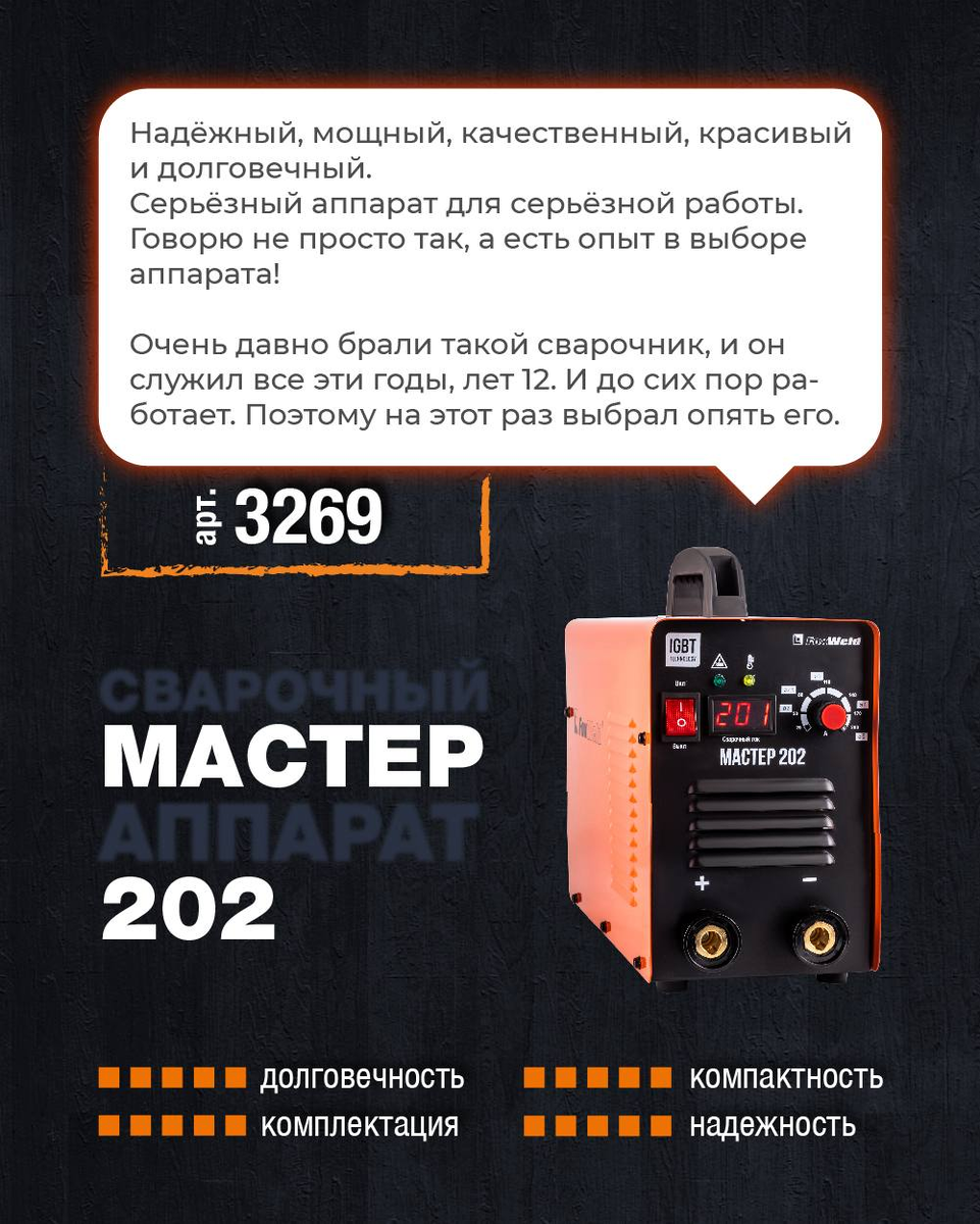 МАСТЕР 202 — компактный, мощный и надёжный аппарат строго под один процесс: MMA (сварка покрытым электродом). Без «лишних режимов», зато с упором на стабильность дуги и выносливость в реальных условиях. Ключевое преимущество — стабилизация сварочного процесса: уверенный поджиг, «мягкая» дуга и минимум разбрызгивания, что напрямую влияет на качество шва и комфорт работы. ✔️ПВ 100% на максимальном токе Аппарат работает без остановок весь рабочий день — без перегрева и потери стабильности дуги. ✔️ Работа при пониженном напряжении 140–270 В Уверенно варит в «плохих» сетях, где большинство аппаратов теряют дугу или уходят в защиту. ✔️ Защита от ошибочного подключения к 380–400 В Аппарат не выходит из строя: блокирует выходное напряжение и автоматически восстанавливает работу при нормализации сети. ✔️Усиленная силовая часть Передача тока через медные шины большого сечения и байонеты 35–50 мм — минимальные потери мощности и увеличенный ресурс соединений. ✔️ Улучшенная схема стабилизации дуг