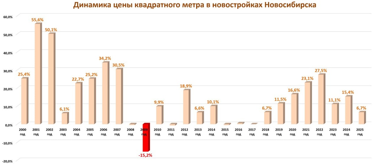 Стоимость квадратного метра в новостройках в Новосибирске с декабря 2000 года по декабрь 2025 года выросла в 25,5 раз — с 6 645 рублей до 169 500 рублей, подсчитал независимый аналитик рынка Сергей Николаев. В течение 25-летнего периода было пять лет, когда цена менялась в пределах статистической погрешности, а в 2009 году и вовсе упала на 15,2%. 12 лет из 25 отмечены существенным ростом, в остальное время динамика была в пределах официальной инфляции. В 2025 году динамика цены квадратного метра в новостройках Новосибирска откатилась на 7 лет, к 2018 году, но тогда рост цен продолжился более высокими темпами, отмечает эксперт. «Пока будет сепарация застройщиков на тех, кто останется в рынке и тех, кто станет банкротом или строительным отделом при банке, цены будут умеренно расти. В это время начнутся реальные ножницы цен, когда стоимость аналогичных объектов будет отличаться на 30–60%. И я никому не советую „гнаться за дешевизною“. Ввод в Новосибирске провалится однозначно. Все зад