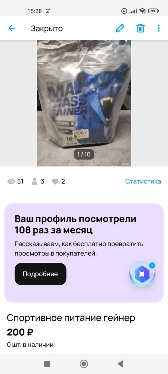 В видео обзоре кухни я показывала вам гейнер, который Андрей купил и не использовал. Так как сроки годности ещё позволяли, я решила выставить продукт на Авито. И в тот же вечер гейнер забронировали, а утром я уже бежала на пункт DPD, чтоб отправить посылку. Сделка состоялась, гейнер забрали, на карту упало 190 рублей.