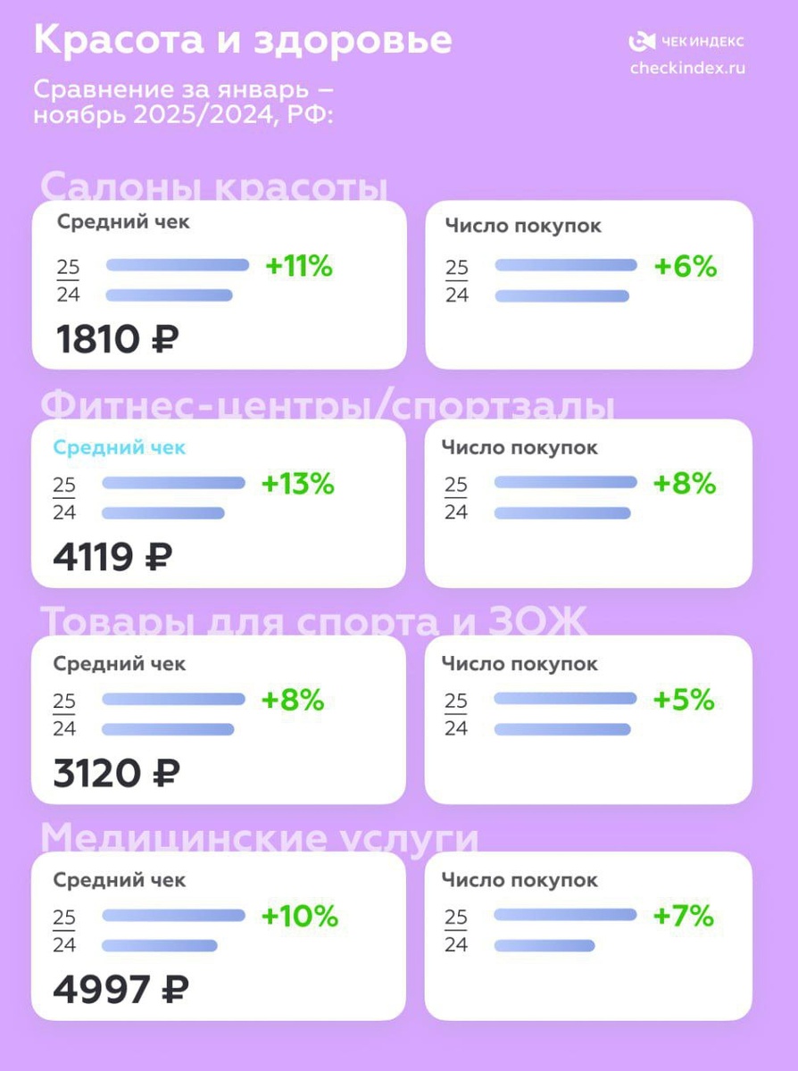 По данным "Чек-индекс", категория "красота, спорт и здоровье" - всё ещё в моде, и само собой, в росте - пусть и без прошлогоднего спринтерского ускорения. Что по цифрам за январь-ноябрь 2025 года: - салоны красоты: медианный чек 1810 ₽ (+11% год к году), количество покупок +6%; - фитнес и спортзалы: 4119 ₽ (+13%), покупки +8%; - товары для спорта и ЗОЖ: 3120 ₽ (+8%), покупки +5%; - медицинские услуги: 4997 ₽ (+10%), покупки +7%. И этот рост сейчас про комплексность и премиум. Клиенты всё чаще выбирают премиум-услуги, долгосрочные программы и комплексные решения. #торговля #beauty #fitness #health #аналитика #красота #ЗОЖ #фитнес #новостиритейла #ритейл #спорт #retail #retailnews 👍 Знание — сила! А подписка — кнопка!