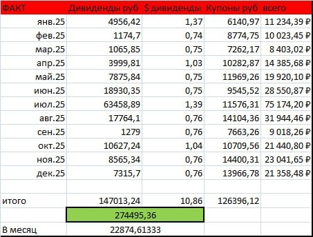 Год выдался неоднозначным, но цифры — вещь упрямая. Делюсь результатами своего портфеля: 💰 Пассивный доход: За год купонами и дивидендами пришло 274 000 рублей. Мой план стоял на отметке 290 000 рублей — немного не дотянул. (в среднем ~22 800 руб. в месяц «чистыми»). 📈 Состояние портфеля: • Текущая стоимость: ~7 750 000 руб. • На начало года было: ~5 000 000 руб. • Мои пополнения за год: 2 650 000 руб. 🧐 Итог по доходности: Если вычесть пополнения, чистый рост тела портфеля составил всего +100 000 рублей. Объективно — это очень мало для такого капитала. Фактически, рынок стоял на месте, и общая сумма выросла в основном за счет моей дисциплины и вливаний. 💭 Мысли: Расстраивает ли это? И да, и нет. С одной стороны, хочется видеть «ракеты», с другой — я понимаю, что «пружина сжимается». Срок инвестирования у меня — не один год, и такие периоды накопления массы без резкого роста цены — отличное время для формирования фундамента.
