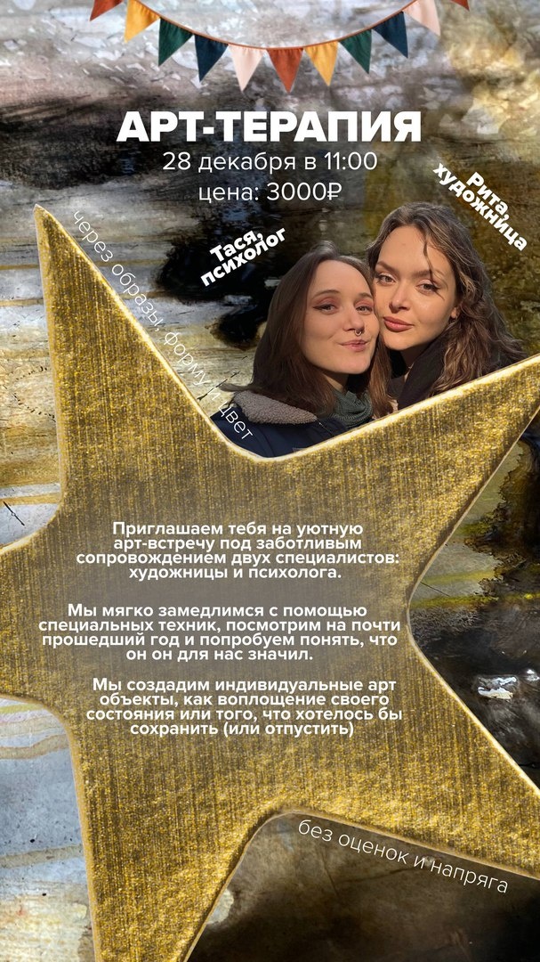 » Уютная арт-встреча, которая предлагает участникам возможность замедлиться и осмыслить прошедший год под руководством художницы и психолога. Используя специальные техники, участники создадут индивидуальные арт-объекты, которые помогут воплотить текущее состояние, сохранить важное или отпустить ненужное. Процесс не требует художественных навыков и проходит при полном сопровождении специалистов. Что будет на арт-терапии? • определим общий вайб этого года • вместе выберем индивидуальный запрос для творческой части (воплощение состояния для ресурса, или наоборот отпустить ненужное) • визуализируем это на холсте • будем опираться на образы, референсы, цвета Когда: Вск, 28 декабря 11:00 Цена: 3000₽ (Для записи пишите @arteritatts) @Давай с нами, Петербург || Сохранить в боте