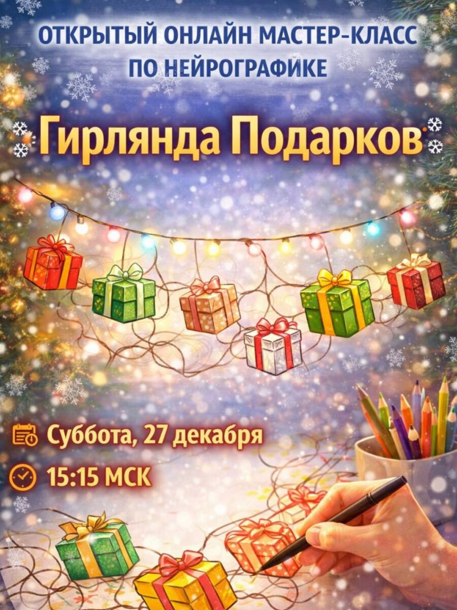 ! ❄️❄️❄️❄️❄️❄️❄️❄️❄️❄️❄️ Приветствуею всех, кто ищет волшебства и хочет успеть настроиться на нужную волну перед самым волшебным праздником 🎄🎄🎄 ! 🎁Если вы не успели составить свой список желаний, или пропустили важный период зимнего солнцестояния, у вас есть уникальная возможность "впрыгнуть в последний вагон уходящего года" и прорисовать свои самые желанные подарк🎁 на предстоящий год! ❗️❗️Приглашаю вас на открытый онлайн-мастер-класс по Нейрографике: "Гирлянда Подарков"❄️❄️❄️❄️❄️❄️ 🗓 Когда: Эта суббота, 27 декабря ⏱️ Во сколько: 15:15 по московскому времени (МСК) 🎁 Формат: Онлайн ✨ Что вы получите на мастер-классе? На этом занятии вы не просто нарисуете красивую картинку, вы: 🎁 Научитесь базовым принципам метода Нейрографика, даже если вы новичок. 🎁 Создадите свой личный, энергетически заряженный рисунок — "Гирлянду Подарков". 🎁 Получите мощный заряд позитивного настроя и веры в чудеса! 🗓 Что понадобится для участия? Подготовка очень простая, все необходимые матери