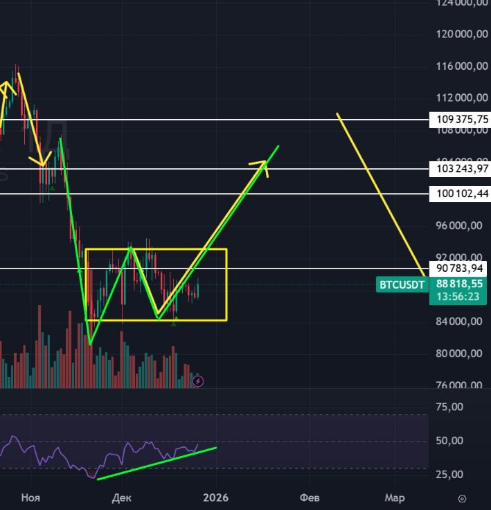 🟢Обычно деньги всегда перетекают из того что перекуплено в то, что еще не разогнано. И мне кажется, что биткойн как раз такой актив. Как говорили не протяжении нескольких лет - цифровое золото. И это цифровое золото болтается в боковике никому не нужное, в то время как металлы и снпи переписывают исторические хаи. 🟢Тут у нас есть накопление в желтом прямоугольнике - жду из него выход вверх. Трактую это накопление как лонговое. А так же есть вероятность формирования фигуры "двойное дно". 🚗 Жду биткойн вверх, возможно, это будет памп перед большим падением всех разогнанных активов. #Биткойн #BTCUSDT #BTC #IBIT #IMOEXBTC #bogdanoffinvest