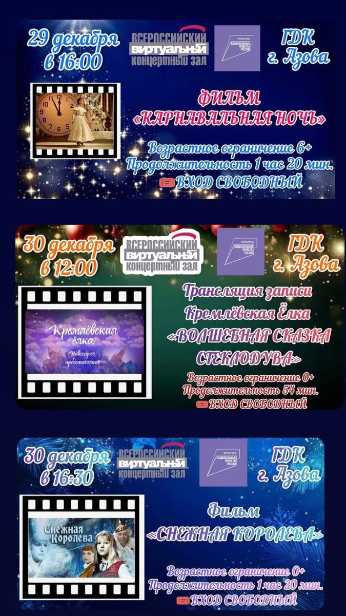 🏛️ГДК г. Азова На экране виртуального концертного зала - Фильм «Карнавальная ночь» Режиссёр: Эльдар Рязанов 🎟️Вход свободный. ⌛Продолжительность 1 час 20 мин. Возрастное ограничение 6+ ▫️30 декабря в 12:00 🏛️ГДК г. Азова На экране виртуального концертного зала - трансляция записи из Государственного Кремлёвского Дворца Новогоднее представление «ВОЛШЕБНАЯ СКАЗКА СТЕКЛОДУВА» 🎟️Вход свободный. ⌛Продолжительность 54 мин. Возрастное ограничение 0+ ▫️30 декабря в 16:30 🏛️ГДК г. Азова На экране виртуального концертного зала - Фильм «СНЕЖНАЯ КОРОЛЕВА» Режиссёр: Геннадий Казанский 🎟️Вход свободный. ⌛Продолжительность 1 час 20 мин. Возрастное ограничение 0+ ГДК г. Азова 🏛️ в MAX ⬇️ https://max.ru/id6140005842_gos #гдкАзов #афишагдк #афишаазова 👉Подписаться на канал "АН"❗️