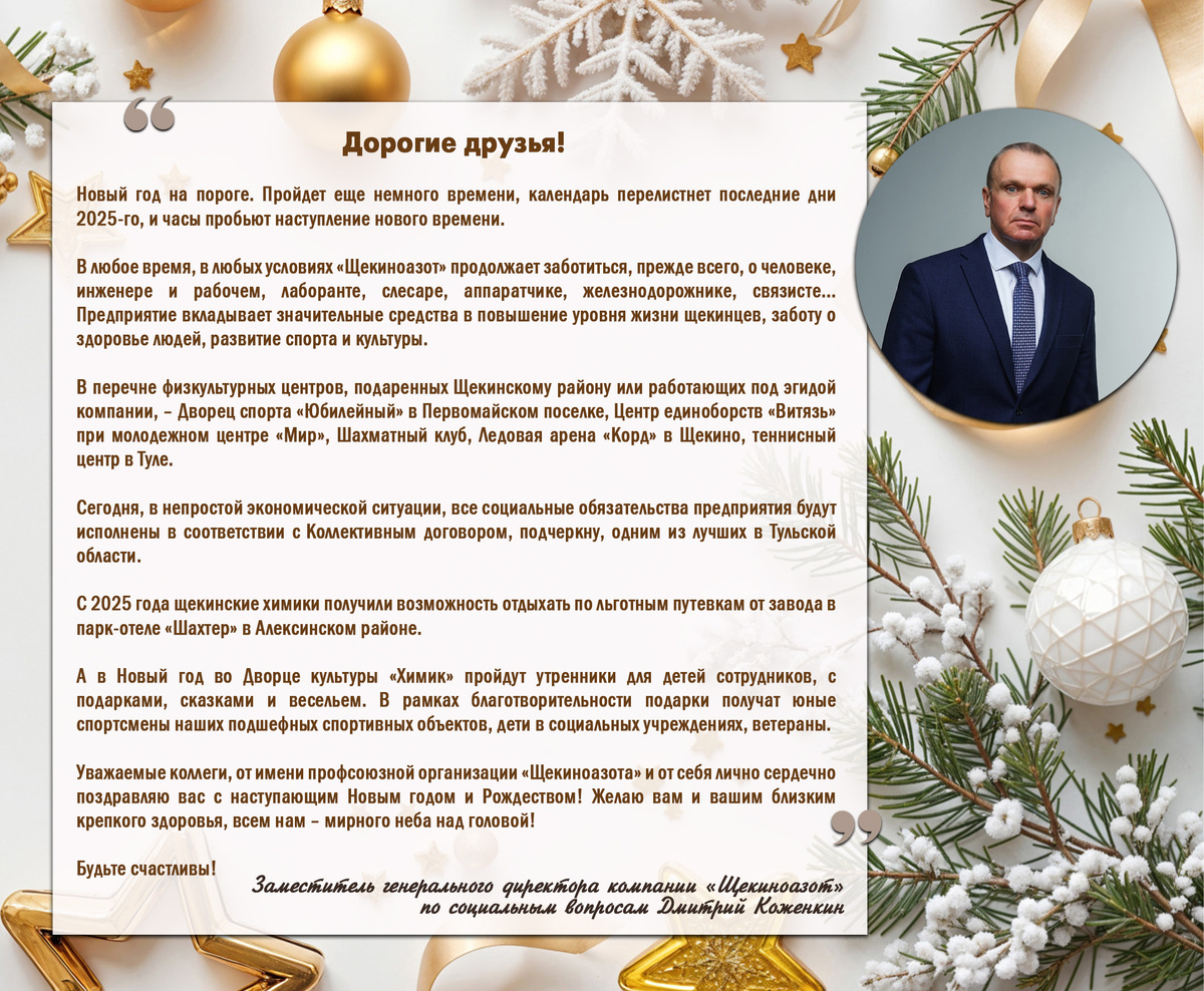 В преддверии самого теплого и доброго праздника, когда атмосфера чудес и волшебства наполняет все вокруг, продолжаем делиться пожеланиями – искренними, душевными, наполненными благодарностью за каждый момент уходящего года, за труд и созидание, ответственность и верность делу. Химики, принимайте поздравления от руководителей компании!