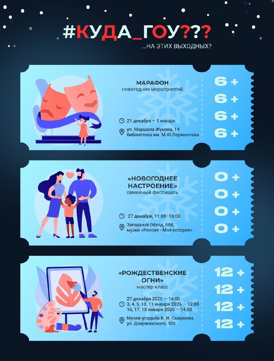 ? Последняя неделя года, а у кого-то – последние дни в Ставрополе перед отъездом домой на праздники. Проведите эти дни с пользой и ловите подборку мест: 🔹Марафон новогодних мероприятий в библиотеке им. Лермонтова 🔹Семейный фестиваль «Новогоднее настроение» 🔹Мастер-класс «Рождественские огни» 🔹Новогодняя ремесленная ярмарка товаров ручной работы 🔹Балет «Щелкунчик» в театре драмы 🔹Выставка «Моя любимая новогодняя игрушка» 🔵 Подписаться