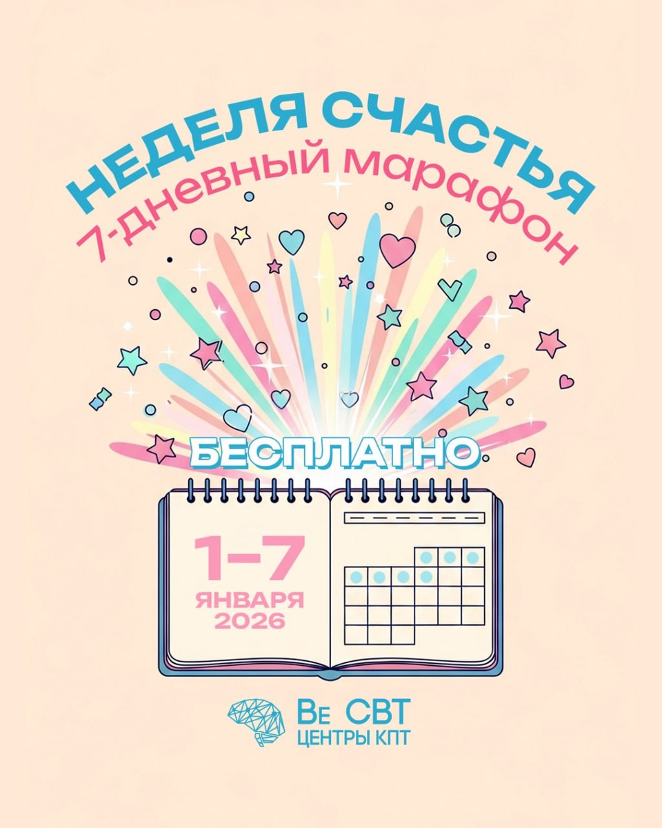 » В праздничные дни легко вернуться к старым привычкам и «наезженной колее». Как провести январские праздники, чтобы начать год обновленными, отдохнувшими и в хорошем настроении? Что делать, чтобы запастись энергией и настроиться на нужный лад для новых свершений? ✨Приглашаем на бесплатный 7-дневный марафон «Неделя счастья», который пройдет с 1 по 7 января и будет посвящен простым, но эффективным практикам осознанности (майндфулнесс). Как связаны майндфулнесс и счастье? 🔍 Исследования показывают, что регулярная практика увеличивает выработку «гормонов счастья» — дофамина, серотонина и эндорфинов. Присоединяйтесь, если вы хотите провести праздничные дни с пользой и удовольствием! Что нужно, чтобы участвовать? Быть подписанным на наш телеграм-канал и следить за уведомлениями. Новое задание будет приходить каждый день в 10:00 (выполнить его можно позже), а выполнение займет от 5 до 30 минут. BeCBT