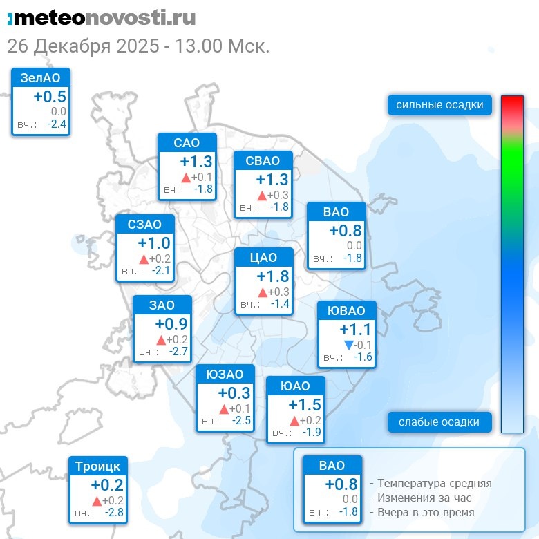В 13:00 в Москве было от +0.1°C до +2.3°C, средняя температура +1.1°C #погода #Москва #зима #температура #26декабря #пятница