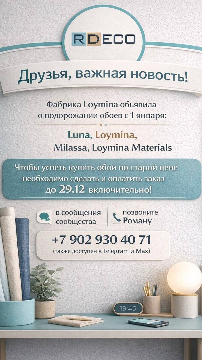 ☝️ Фабрика Loymina объявила о подорожании с 1 января, оно касается обоев: Luna, Loymina, Milassa, Loymina Materials. Чтобы успеть купить по старой цене необходимо сделать и оплатить заказ до 29.12 включительно! Чтобы сделать расчет и узнать подробности, напишите нам @RDeco40 👈