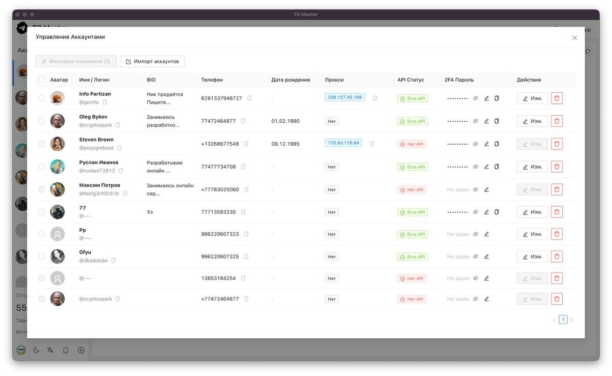 6.0. Новые очень крутые функции: - Менеджер Управления аккаунтами. Где вы можете видеть характеристики всех ваших аккаунтов и менять настройки через API. - Массовое упрваление аккаунтами. Меняйте массово аватарки, имена, логины, BIO (описание профиля) и настройки конфиденциальности. - Импорт аккаунтов из файлов в формате sessisn+json. Можно загружать одним или несколькими архивами, система сама найдет session файл и импортирует авторизацию в API. При авторизации сразу можно указать прокси, он автоматически применится для апи и для WEB версии. Предыдущая версия инсталятора уже не работает. Нужно скачать новую версию чтобы обновить оболочку программы. Скачать обновление для Windows \ Mac OS \ Linux можно через ТГ бота @tgmaster_ru_bot Больше новостей про TG мастер на Канале PRO Телеграм https://prkr.ru/tg