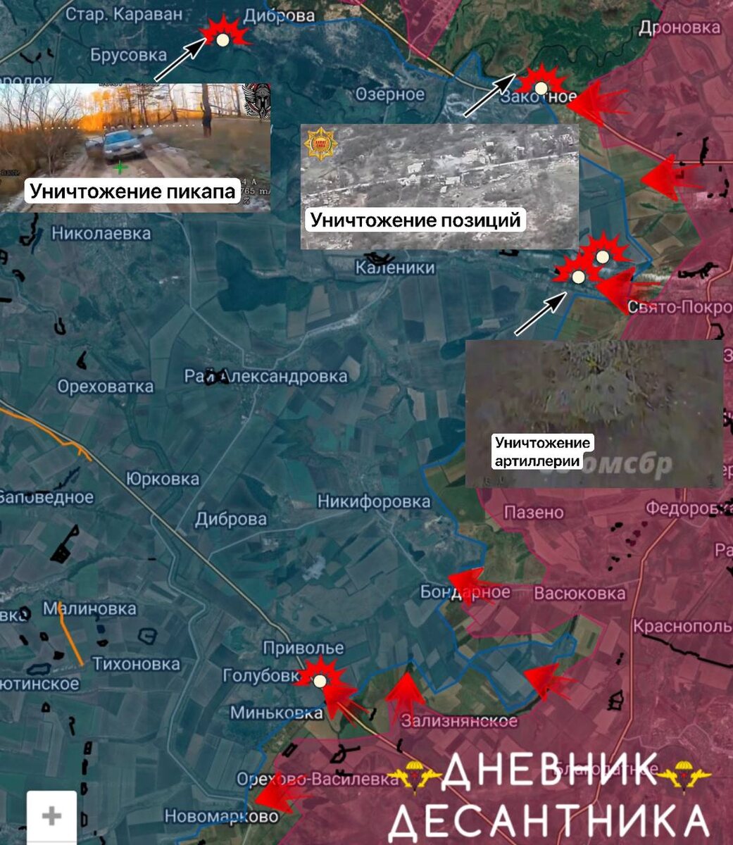 Бойцы 3ОА продолжают ломать оборону противника и продвигаться вперед у Закотного, к Резниковке, также бои идут у Бондарного и Марково. ▫️После того, как наши войска овладели высотой у Кирово (Свято-Покровского) взяли под контроль само село. Также наши войска продвинулись к Резниковке и ведут бои в восточной части. Артиллерия и расчеты БПЛА наносят удары по выявленным блиндажам и орудиям севернее Резниковки. ▫️Западнее Кузьминовки бойцы ВС РФ продвинулись по лесопосадке с охватом квадрата 1х1 км и тем самым вышли на высоту, позволяющую вести контроль за передвижением врага в лесных массивах западнее. Противник начал отступать. ▫️В Закотном а аэроразведка выявила скопление сил противника, пункт воздушной разведки и пункт управления беспилотными летательными аппаратами ВСУ, после чего расчёт гаубицы Д-30 отработал по координатам. В результате огневого воздействия артиллерии, оба вражеских объекта уничтожены. ▫️В районе Дибровой идут бои за лесные зоны и наносятся удары по логистике В