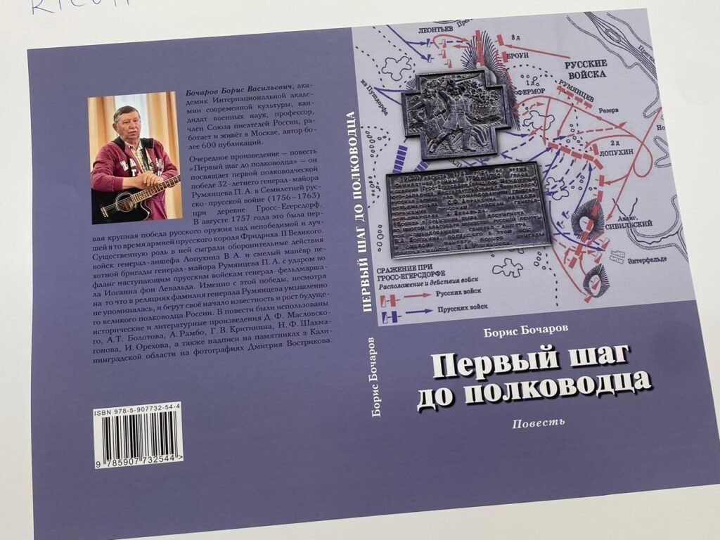 В издательстве «Радуга» вышла в свет очередная книга академика ИАСК Бочарова Бориса Васильевича под названием «Первый шаг до полководца». Это повесть о первом полководческом успехе командира пехотной бригады генерал-майора Румянцева Петра Александровича в сражении при Гросс-Егерсдорфе в 1757 году.