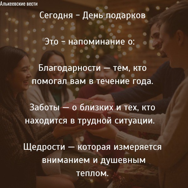 Современный смысл праздника 💐День подарков сегодня — это напоминание о важности: 💐Благодарности — тем, кто помогал вам в течение года. 💐Заботы — о близких и тех, кто находится в трудной ситуации. 💐Щедрости — которая измеряется не стоимостью подарка, а вниманием и душевным теплом. ❤ Как можно отметить этот день? ✅Соберите ненужные, но хорошие вещи и передайте их в благотворительные организации. ✅Приготовьте угощение или просто проведите время с теми, кому может быть одиноко в праздники. ✅Подарите близким «подарки-впечатления»: совместную прогулку, игру, домашний киносеанс или просто искренний разговор. ✅Поблагодарите людей, которые делают вашу жизнь лучше: коллег, учителей, врачей, курьеров. День подарков — это прекрасный повод продлить магию праздника, выйдя за рамки материальных подарков. Это день, когда доброта, благодарность и человеческое тепло становятся главными сокровищами. Пусть ваша щедрость вернётся к вам радостью и светом! ✨