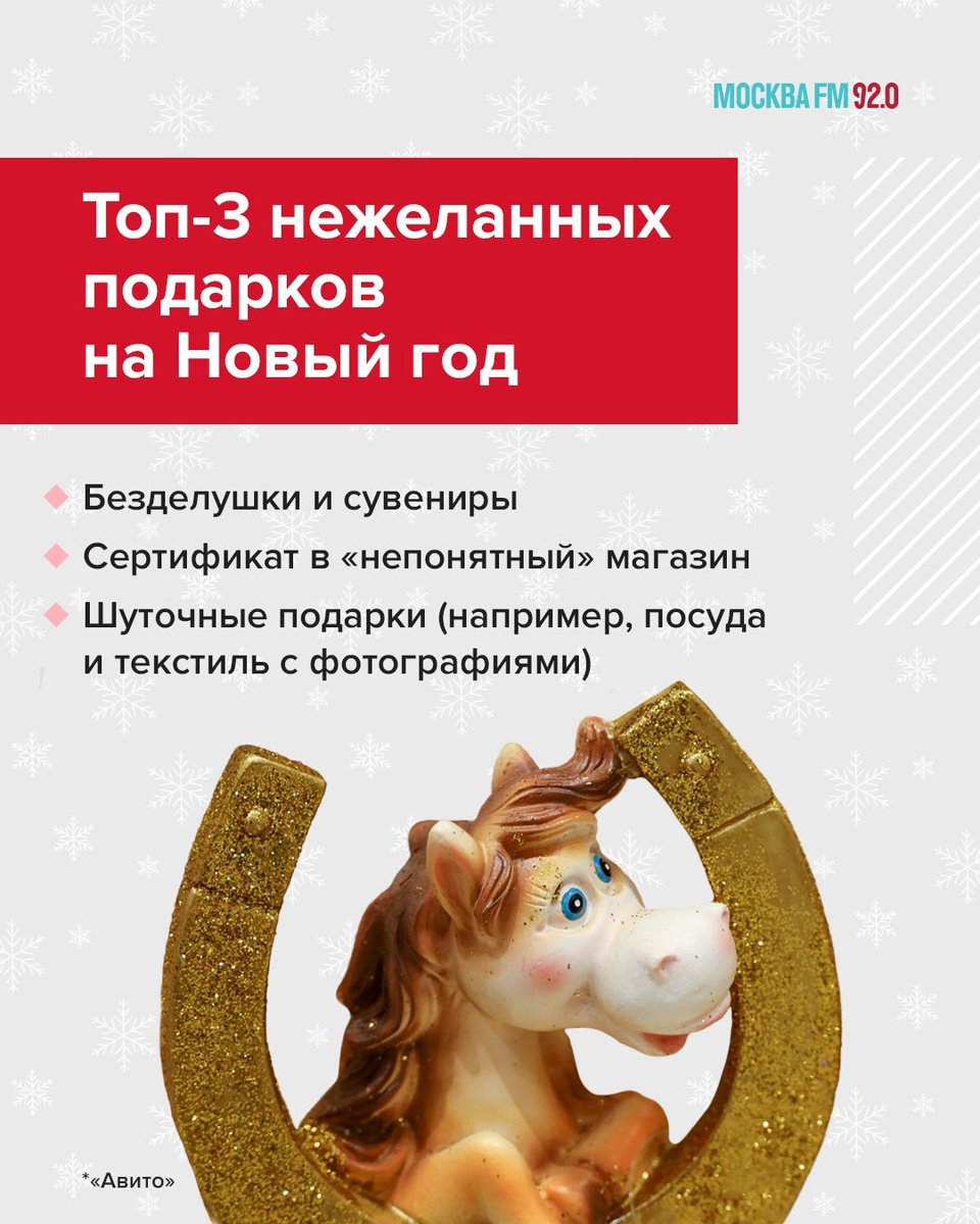 Большинство россиян хранят ненужные подарки «на всякий случай» или используют их, даже если они не нравятся, и, конечно, передаривают. Женщины также не хотели бы получить в подарок мягкие игрушки и ненужную косметику или парфюм, а мужчины — носки и нижнее бельё. ❓ Админу мила еда в качества подарка: бюджетно и практично 🥖🧀 А что дарите вы? 📌 Подписаться на Москва FM / Наш чат-бот / Мы в МАХ