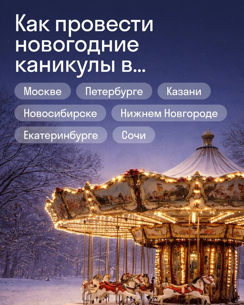 ? ⛄️ Музей, каток, театр, рождественская ярмарка — собрали идеи, чем заняться в крупных городах России. Сохраняйте себе, чтобы запланировать яркие каникулы! Москва ❄️Новогодние ярмарки на ВДНХ и Манеже ❄️Шоу Ильи Авербуха «Буратино» ❄️«Усадебный» каток с естественным льдом в усадьбе Воронцово ❄️«Новогоднее путешествие в Заполярье» в Кремле ❄️Ледовое шоу Татьяны Навки «Золушка» ❄️Ёлка в Третьяковской галерее ❄️Фестиваль ледовых скульптур в Парке Победы ❄️«Морозко» в цирке Никулина Санкт-Петербург ❄️«Снежные сны» в цирке на Фонтанке ❄️Каток в «Новой Голландии» ❄️Рождественская ярмарка на Манежной площади ❄️Фестиваль ледовых скульптур «КроншЛёд» ❄️«Щелкунчик» в Михайловском театре ❄️Новогодняя программа в Эрмитаже ❄️Спектакль «В гостях у Андерсена» Казань ❄️Ледовое шоу «Настоящий Щелкунчик» ❄️Цирковая сказка «Конёк-Горбунок» ❄️Спектакль «Снежная королева» в театре кукол «Экият» ❄️Шоу стеклодувов и рождественский концерт в Свияжске ❄️Каток в парке «Чёрное озеро» ❄️Роспись ёлочной иг