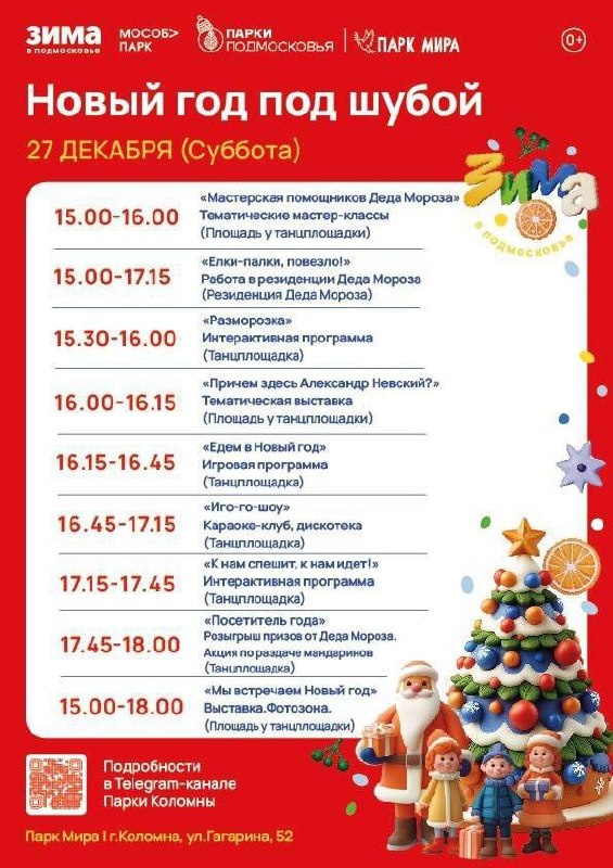 »! 📅 27 декабря, с 15:00 до 18:00 📍 Парк Мира, Парк «Сосновый бор», Сквер им.В.А.Зайцева. ✨Вас ждёт насыщенная праздничная программа, которая подарит море ярких эмоций: - Зажигательная предновогодняя дискотека с любимыми сказочными героями; - Концерт творческих коллективов; - Интерактивные мастер-классы; - Весёлые игры, конкурсы, эстафеты и тематические программы; - Яркие фотозоны; - Уютная самоварная и чайная станции. 💫В этот день в парке будет работать множество тематических площадок — каждый найдёт занятие по душе и заберёт с собой заряд отличного настроения! Не упустите возможность создать незабываемые воспоминания с близкими, раскрыть свой творческий потенциал и почувствовать приближение праздника — ведь Новый год всё ближе! 🙌Мы ждём вас, чтобы вместе встретить самый чудесный волшебный вечер зимы! Приходите! Будет весело, тепло и интересно!