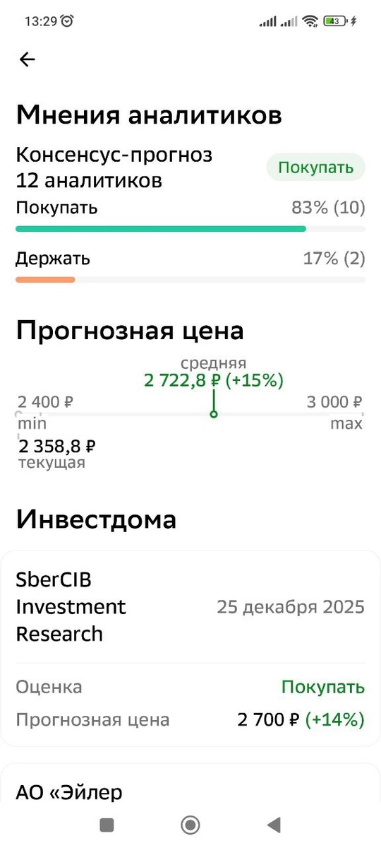 , https://dzen.ru/media/pavelinvest11/top-investideia-na-rynke-seichas-692abc56f2a7c446e9ffbc24 то поздравляю. За месяц около 11% прибыли, с дивидендами. Я входил на 100% портфеля в эту акцию. Держу дальше. Планирую продавать немного не доходя до верхней границы канала. Думаю, ещё столько же даст прибыли. Полюс в топ-5 акций рейтингов брокеров, но потенциал роста небольшой. В сбер инвестициях консенсус цена 2722 р. По технике можно прикинуть, что цена как раз достигнет 2700 к середине февраля. Сейчас 2360. Можно будет продать и переложиться в другие отличные акции, такие как т технологии, озон, Яндекс, икс 5. Также мне нравится лента, но надо подождать спуска к трендовой линии.