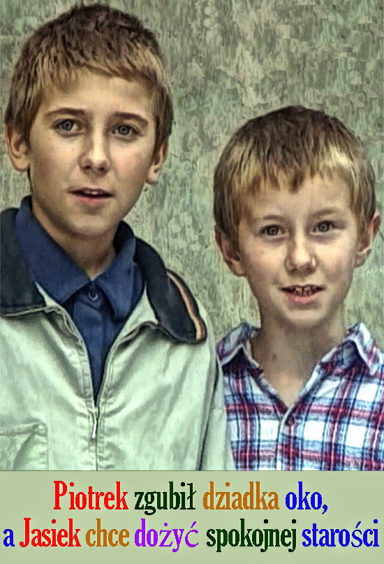 Оригинальное название: Piotrek zgubił dziadka oko, a Jasiek chce dożyć spokojnej starosci Жанр: детский, семейный, мини-сериал Производство: Польша (Telewizja Polska S.A. (TVP1) В ролях: Матеуш Янковский, Игорь Вольский, Анджей Ивиньский, Зофья Червиньска, Тамара Арцюх, Збигнев Янковский... Режиссёр: Мацей Войтышко Два шалопая - двенадцатилетний Пётрек и десятилетний Ясек из семьи провинциальных актёров развлекаются подсматривая за привычками взрослых и копируя их, что иногда приводит к нежелательным последствиям. Мини-сериал по одноимённому произведению Люцины Легут