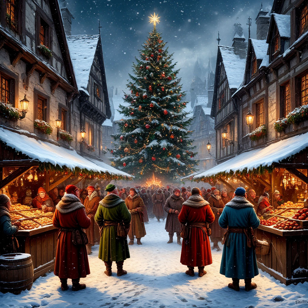 Вот парочка вышла на главную площадь, где стояла гигантская елка, украшенная пряниками и орехами в серебристой бумаге и стеклянными шарами, в которых отражался весь город. А возле елки на специальной арке для веселой забавы висела огромная ветка омелы, перевитая красными лентами. По древнему обычаю, кто под ней поцелуется, тот навеки будет вместе, или же по крайней мере год будет иметь счастье в любви.