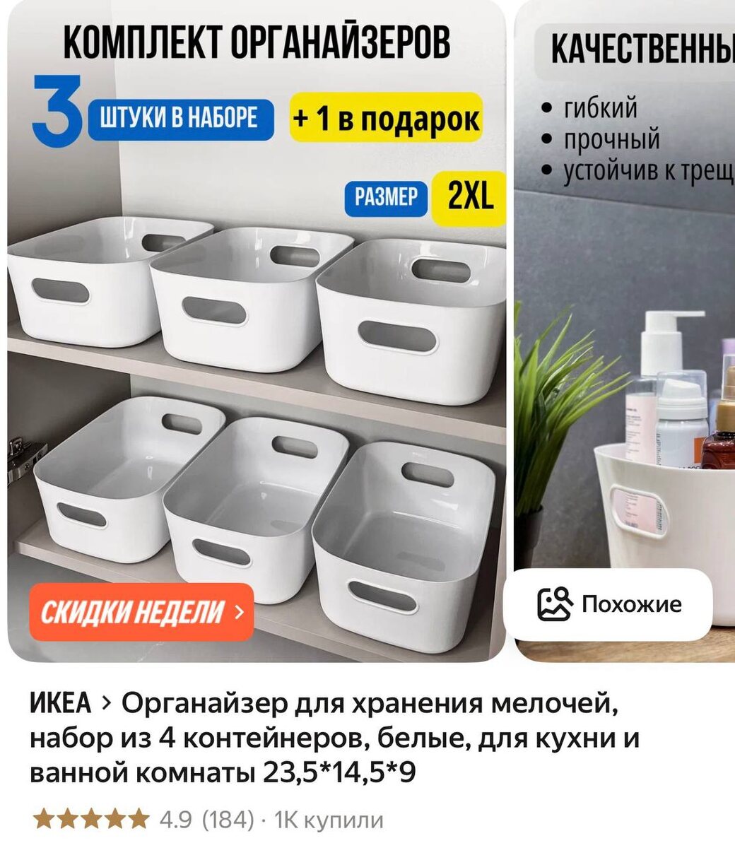 🫨😀🫨 Органайзер для хранения мелочей, набор из 4 контейнеров, белые, для кухни и ванной комнаты 23,5*14,5*9 https://market.yandex.ru/cc/8Mnnfg 🛍DEC122-AF — скидка 100 ₽ на один любой заказ от 5000 ₽ ✅ Канал по скидкам 🔣 Бот с промокодами