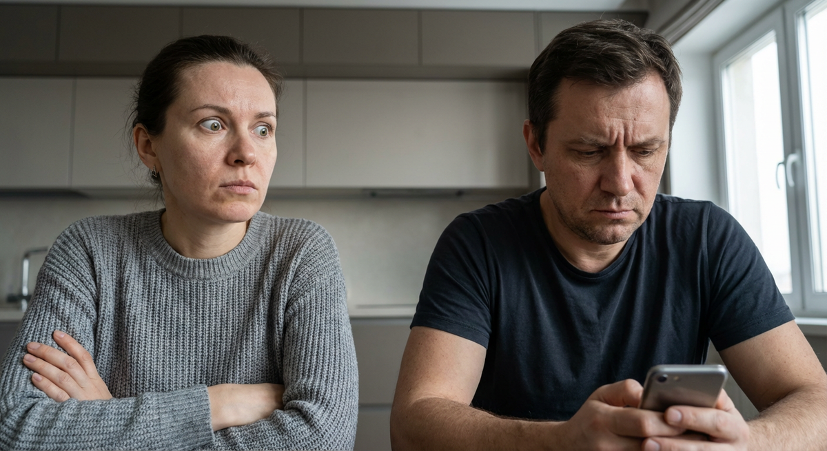 Андрей, сидевший на диване с телефоном в руках, вздрогнул. Он быстро свернул какое-то приложение и поднял на жену взгляд, в котором читалась смесь вины и испуга, словно у школьника, разбившего окно в учительской.