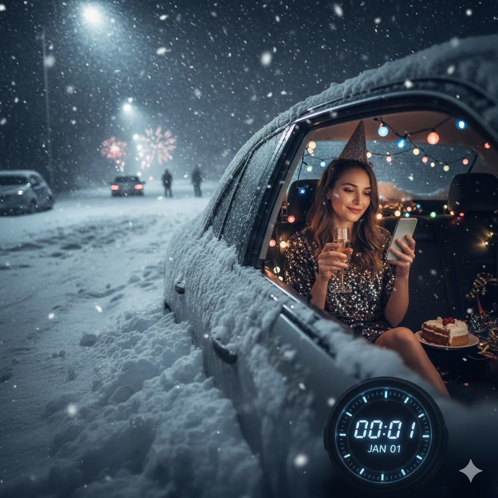 Да, всё пошло не по плану. Но где ещё встретишь полночь вот так — на просёлочной дороге, с незнакомым водителем, с бокалом шампанского, куда незаметно залетают снежинки? В этот момент она ощутила странную, почти волшебную гармонию: будто сама судьба мягко подправила её маршрут, подарив нечто особенное.