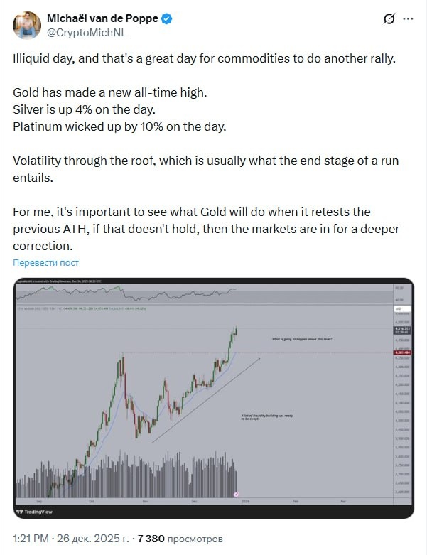 Золото обновило исторический максимум. Серебро подорожало на 4% за день. Платина сделала всплеск на 10% за день. Волатильность зашкаливает, что обычно и характеризует финальную стадию роста. Для меня важно увидеть, как поведет себя золото при повторной проверке предыдущего исторического максимума: если он не удержит, рынки ждет более глубокая коррекция.