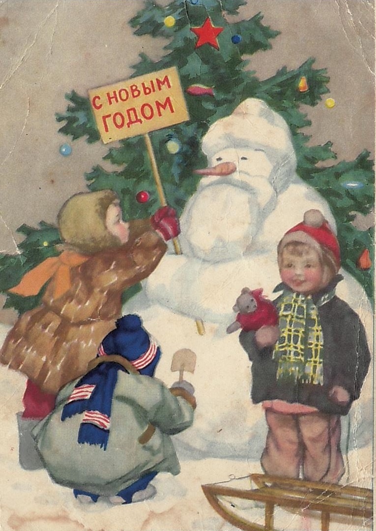 Дорогие друзья! Мы продолжаем публикацию советских поздравительных открыток из коллекции нашего музея. Уверены: многие из вас до сих пор хранят дома эти реликвии. А как же иначе, ведь на них остались тёплые пожелания от родных и близких, приветы из далёкого прошлого. Сегодня расскажем о новогодних открытках 1950-60-х годов. Например, эта открытка была выпущена тиражом 500 тысяч экземпляров 72 года назад - в 1953 году. На обороте - поздравление в стихах "дорогой подружке Тамаре". В Советском Союзе дети на только обменивались поздравительными открытками друг с другом, но и активно их коллекционировали. А еще именно ребятам чаще всего доверяли бросить в почтовый ящик пухлую пачку поздравительных открыток от всей семьи, которые разлетались в разные концы страны. Неудивительно, что героями многих сюжетов с новогодних открыток тоже были дети. Персонажами открыток могли быть герои популярных мультфильмов. Например, "Когда зажигаются ёлки" (1950 г.), весёлые снеговики, лесные обитатели и, кон