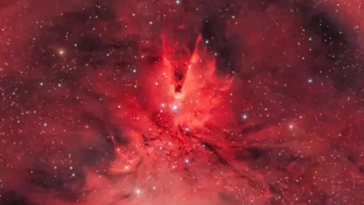 Скопление Снежинки (NGC 2264) — большая и активная область космоса, где формируются новые звезды, расположенная примерно в 2700 световых годах от Земли. Она находится в пределах неяркого, но выразительного созвездия Единорога. Астрономы обратили внимание на область, которая удивительно похожа на светящуюся праздничную елку. Новорожденные звезды, создающие облака газа и пыли, образуют треугольную форму, увенчанную эффектной туманностью Конус и окутанную туманностью Лисий мех внизу. Вместе эти скопления создают праздничную космическую картину, охватывающую почти 80 световых лет, пишет Science Daily. Когда молодые звезды загораются, они выделяют интенсивную энергию, которая заставляет окружающий газообразный водород светиться красным. Светящиеся области известны как эмиссионные туманности. Темные пылевые облака также пронизывают эту область, блокируя свет от звезд, находящихся за ними, и создавая драматические тени. В местах, где эта пыль находится вблизи горячих, недавно образовавшихся з