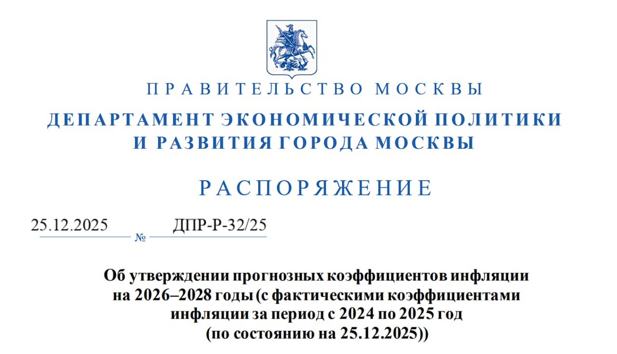 ⚡️Распоряжение Департамента экономической политики и развития города Москвы от 25.12.2025 № ДПР-Р-32/25 «Об утверждении прогнозных коэффициентов инфляции на 2026–2028 годы (с фактическими коэффициентами инфляции за период с 2024 по 2025 год (по состоянию на 25.12.2025)» ✔️Для расчета капитальных вложений в строительстве на период до 2028 года включительно и формирования начальной (максимальной) цены контракта. *️⃣Приложение на 89 листах по Отраслям и годам. 📱ТСН-2001 и ГРАНД-Смета