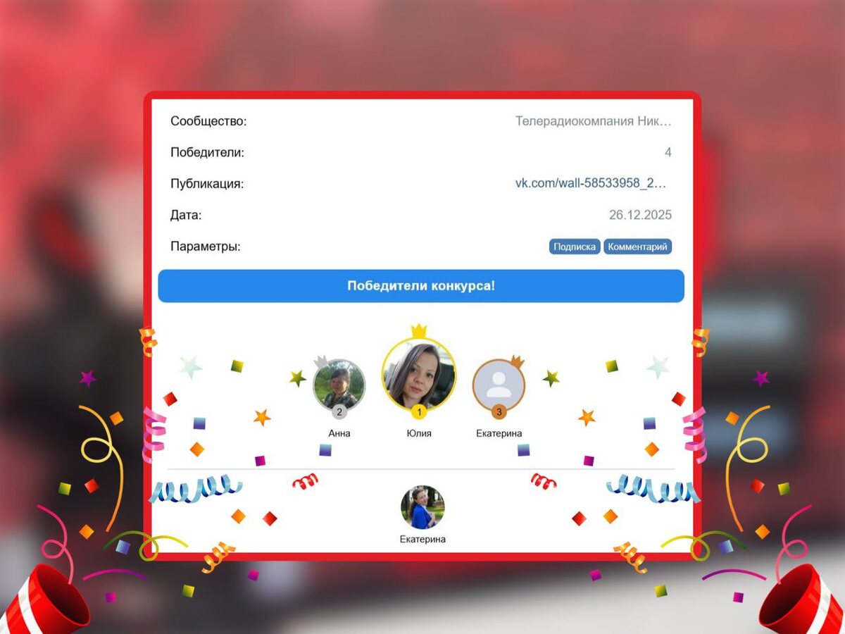 Рандомайзер выбрал 4 победителей: 🔵Юлия Тимошина (Подару) 🔵Анна Тульская 🔵Екатерина Журавкова 🔵Екатерина Кураева (Филиппова) 💫 Чтобы забрать подарок, нужно написать в сообщения нашего сообщества ВКонтакте. 📺 Подписывайся на наш канал в Максе
