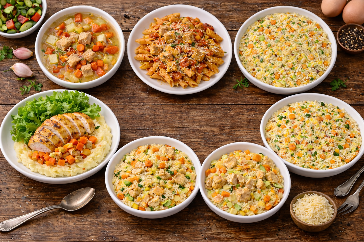 Этот набор ужинов показывает, как из простых продуктов составить полноценное меню на неделю. Выбранные ингредиенты остаются доступными и универсальными, рекомендованными при правильном питании, а блюда из них легко адаптируются под личные вкусы. Используя куриное филе, овощи, яйца, рис, пасту и сыр, можно получать вкусный, полезный и сбалансированный ужин каждый день.