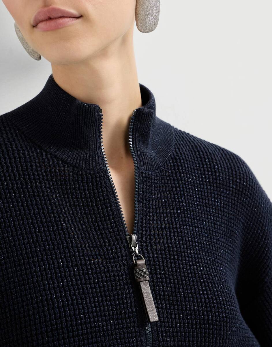 Сияющие детали преображают свободный и неформальный стиль кардигана Sparkling Texture из хлопка. На мягкой поверхности изделия выделяются блики нити ламе, придавая женственное и изысканное сверкание. Низкая линия плеч и широкие рукава образуют комфортный силуэт, который завершается практичной застежкой-молнией.