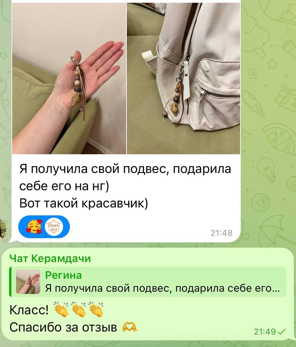 🫶 Привет! Если вы со мной давно, то знаете, что я всегда радуюсь, когда гости уходят довольные из мастерской после двухчасовой лепки. Но ещё больше я радуюсь, когда мои изделия находят новый дом 🏠 Летом я проводила челлендж #100_бусин_на_даче и слепила много бусинок из которых потом делала кулоны и подвесы. Одна из них — круассан — полюбилась Регине и я сделала для неё подвес с этой бусинкой. Я тоже люблю дарить подарки и 31 декабря подарю одному из вас птичку-брелок 🤗 Кто ещё не взял номерок — пишите любой комментарий под этим постом https://dzen.ru/media/yachicheva/nachinaem-nash-rozygrysh-694bb5d60707b354481b44bf и возможно, 31 декабря, именно вы станете обладателем белоснежной фарфоровой птички 🕊 Всем чудесных выходных, Ваша Настя ✨ P.S. До Нового года осталась пять дней! _ _ _ _ _ _ _ _ _ _ _ 🐌 🍀 Забрать изделие и записаться на МК — @yachicheva (ВК, ТГ) 🪴 Посмотреть МК, вдохновиться, вступить в КерамКлуб — @yachicheva (ВК, ТГ) 🌿 Керамдачный дневник — @ker