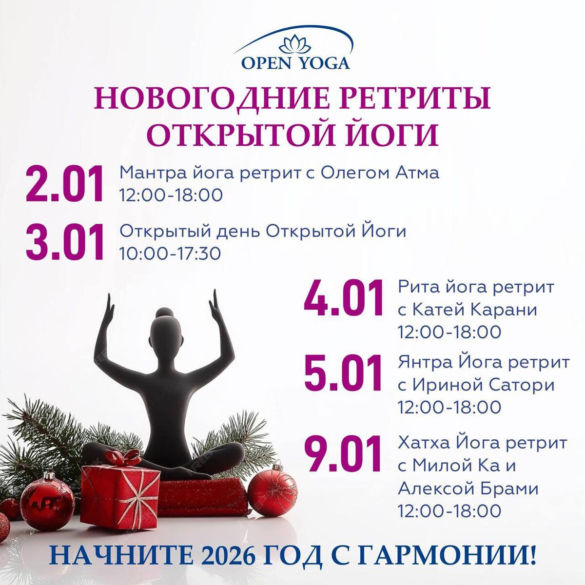 ✨ В первые дни января мы подготовили для вас серию особенных ретритов — каждый со своим настроением, глубиной и смыслом. Выбирайте тот, который откликается именно вам 🤍 🌿 2 января — Мантра-йога ретрит с Олегом Атма 🌿 3 января — Открытый день Открытой Йоги 🌿 4 января — Рита-йога ретрит с Катей Карани 🌿 5 января — Янтра-йога ретрит с Ириной Сатори 🌿 9 января — Парный Хатха-йога ретрит с Милой Касумовой и Алексой Брами Каждый ретрит — это: ✨ 6 часов глубокой практики 🤍 поддержка опытных преподавателей 🌈 пространство для перезагрузки и вдохновения Вы можете выбрать один ретрит или подарить себе целую неделю осознанного начала года 🌟 📍 Место: Open Yoga Palace 📅 Даты: 2–9 января 2026 года 👉 Расписание и регистрация — ➡️ https://docs.google.com/forms/d/1e02q0guVEm-VLT23uAGoPJq4peIxLXsSDaS6WJ63EdY/ 📞 Подробности и вопросы: Олег +79370617413 ✨ Начните 2026 год так, как давно хотелось — в гармонии с собой ✨