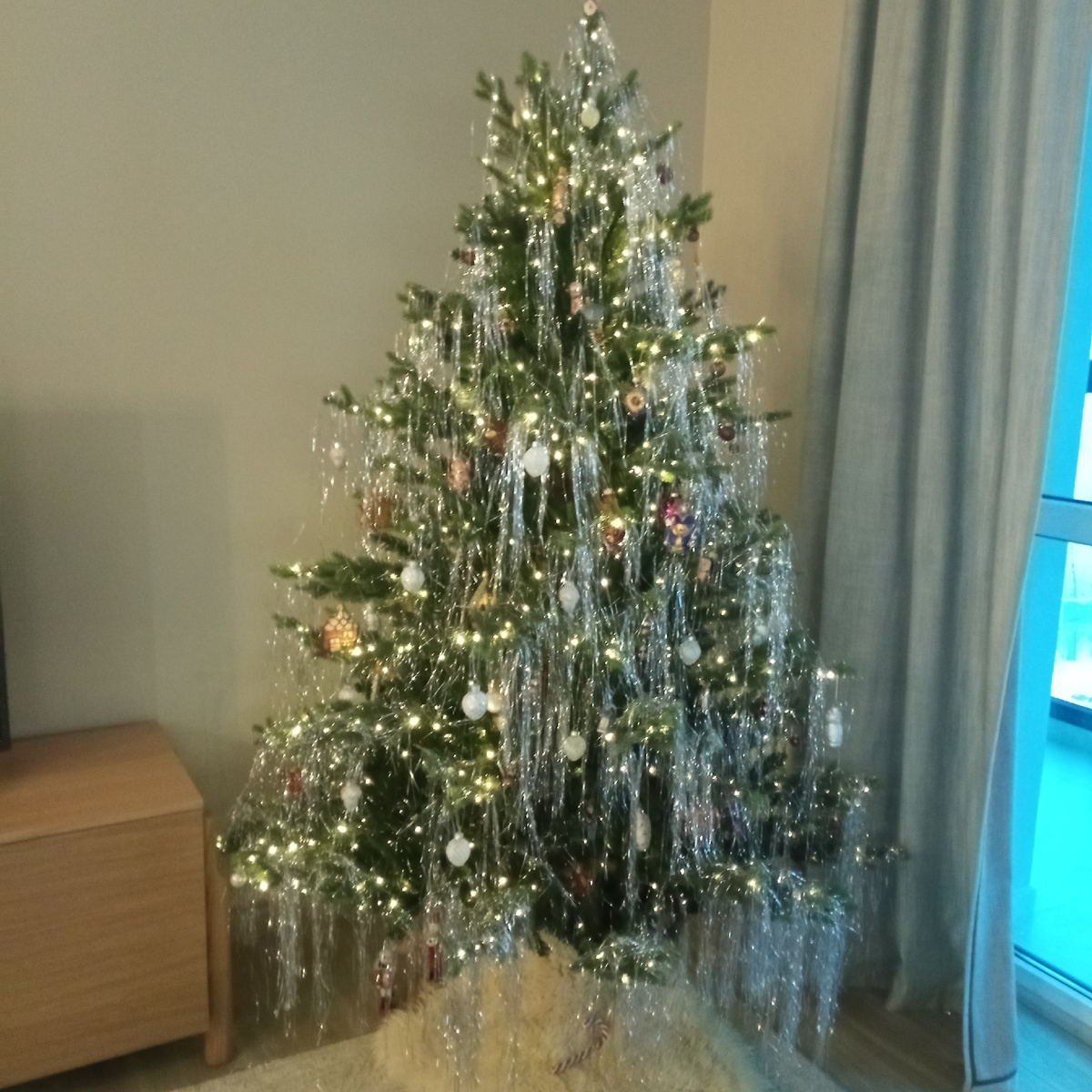 Зашли к детям в квартиру, а у них уже ёлочка нарядная. Такая вся блестящая, огоньки переливаются. Они впервые насыпали такой дождик на ёлку. Очень красиво!