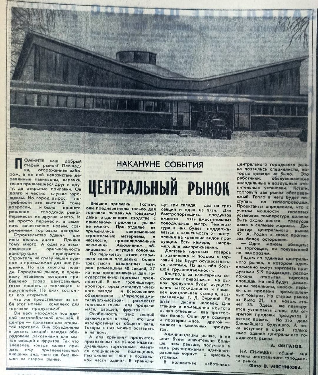 В последних числах декабря 1976 года в Череповце вступило в строй основное здание центрального городского рынка. Его строительство велось долго, в том числе из-за оригинальности конструкции перекрытия. Новый комплекс весь находится под единой шатрообразной крышей. В центре – прилавки, они объединены в 9 секций. По периметру размещены 48 секций, 37 из которых предназначены для государственных торговых предприятий. На новом рынке одновременно могут торговать 519 продавцов. В первый день работы рынка открыла продажи только государственная торговля. «А где же индивидуальный торговец? – вопрошает «Коммунист». – Увы, пока хорошо оборудованные прилавки для торговли овощами, фруктами, мясом, молоком и молочными продуктами в основном пусты. На них сиротливой группкой обосновались традиционные торговцы фруктами, доставленными с благодатного юга». Потому многочисленные посетители торгового центра ограничились ознакомительной экскурсией.