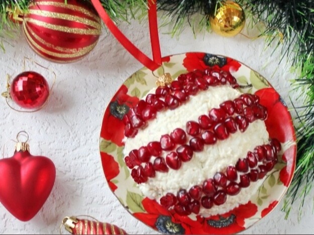 - Салат смажьте сверху майонезом, посыпьте натертыми белками. Украсьте зернами граната