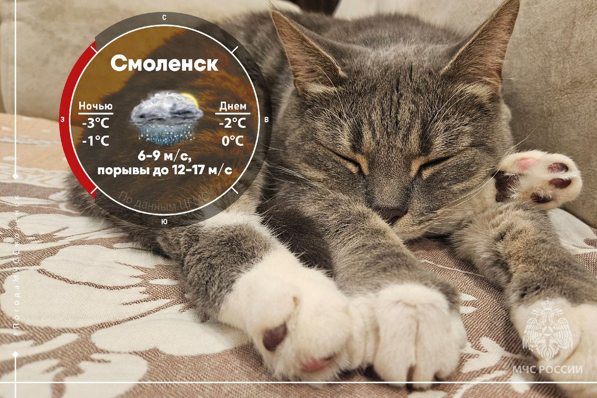 - в Смоленске: ночью -2°С …0°С, днём 0°С …+2°С. Обо всех изменениях в погоде смотри на сайте https://meteoinfo.ru/hdmapsmeteoalarmcfo В таких условиях и пешеходам, и водителям требуется повышенное внимание. Выбирайте подходящую обувь, а при управлении автомобилем соблюдайте скоростной режим. @mchs_smolensk