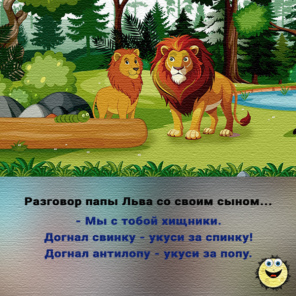 Всем Привет!! Собрал для вас очередную порцию юмора со своими авторскими иллюстрациями. Хорошего вам просмотра.😏 Львы хоть и хищники, но по понятиям немного понимают😁😁😁 У каждого свой способ считать в уме. И ничего страшного если эти способы не верны. 😁😁 Заяц возможно и откосил, но судя по лицу, дурачком останется🤣🤣🤣 Немного черного юмора. Такой врач все болезни разом вылечит😁😁😁🤪 Иногда важно начать всё сначала. Подумаешь, с кем не бывает.🙄😎 Нет, ну а че она делает? Разве так можно? 😁😁😁 Не страшно потерять собаку, если она "Тузик". Главное вы, не потеряйте телефон, а то ведь будет звонить, переживать. Друзья, надеюсь эта статья подняла вам немного настроения. Ставьте лайки, делайте репосты. Буду очень благодарен😀. На моём канале вы можете посмотреть не только статьи с анекдотами, но и МультАнекдоты. Переходите по ссылке))) А еще!! Подписывайтесь на мою страницу вконтакте, добавляйтесь в друзья. Занимаюсь графическим дизайном. Есть портфолио на главной странице. Рад