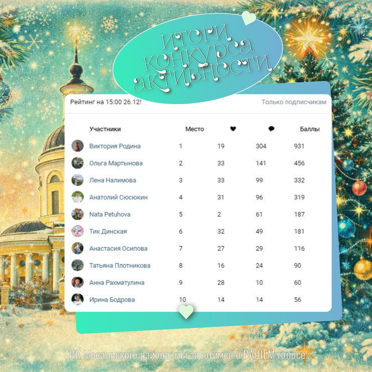 💥 Десять самых-самых преданных наших подписчиков определены! Встречайте бурными лайками победителей: ✅ Виктория Родина ✅ Ольга Мартынова ✅ Лена Налимова ✅ Анатолий Сюсюкин ✅ Nata Petuhova ✅ Тик Динская ✅ Анастасия Осипова ✅ Татьяна Плотникова ✅ Анна Рахматулина ✅ Ирина Бодрова Получить свой заслуженный приз - канцелярский набор с символикой Избирательной комиссии Калужской области можно в Мосальской ТИК по адресу: Мосальск, ул.Советская, 16, каб. 39 🎁 #ТИКМосальскогорайона Наш канал в МАХ https://max.ru/tik_mosalsk