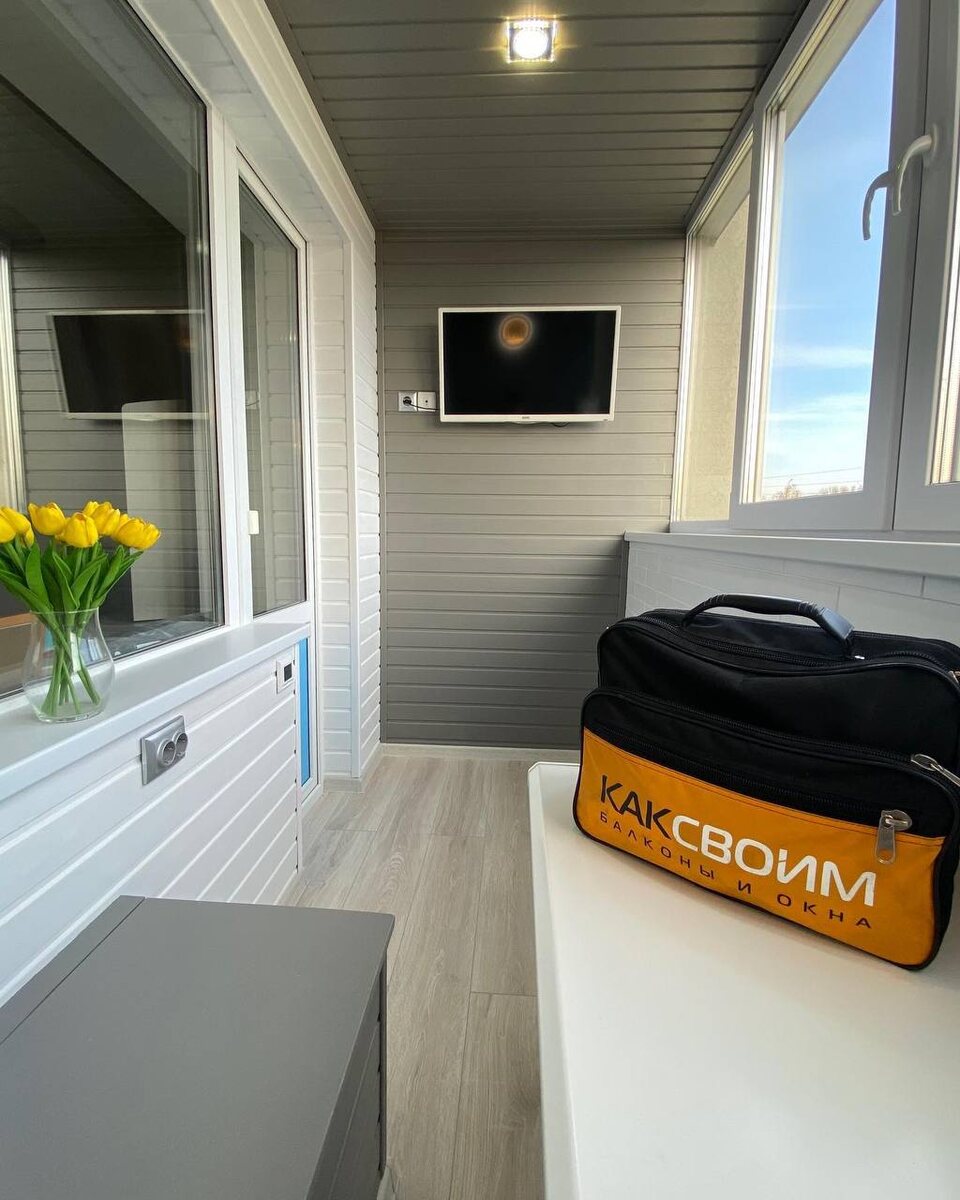 На фото балкон оформлен в спокойной серо‑белой гамме: светлый пол, белые стены, серая панельная стена и мебель создают мягкий фон, на котором легко «разворачивать» любое кино‑настроение. Нейтральная база не давит и не отвлекает от экрана, а значит идеально подходит для просмотра фильмов и сериалов.