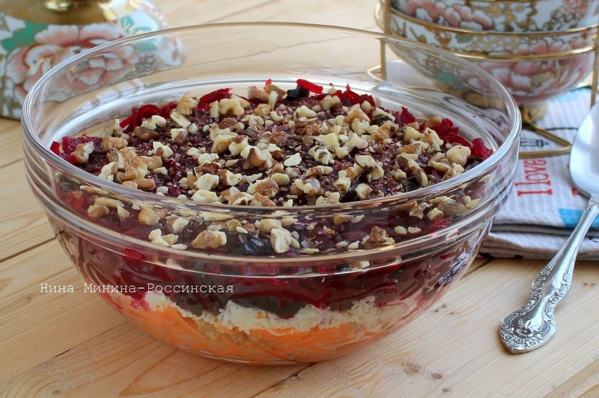 Салат "Любовница" имеет очень оригинальный состав: вареная свекла, сырая морковь, сыр, разные орехи и разные сухофрукты, заправляется майонезом или соусом из сметаны и майонеза.