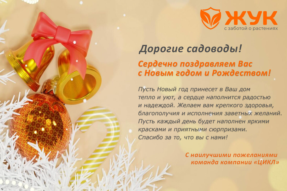 Приветствуем вас, наши дорогие читатели, трудолюбивые и увлеченные дачники! В преддверии самых волшебных новогодних и рождественских праздников весь коллектив ООО Фирма «Цикл» спешит передать вам самые теплые и сердечные поздравления! Надеемся, ваш сезон был щедрым на урожай, а ваши цветники радовали глаз с весны до осени! Знаем, что год был, как всегда, насыщенным. Вы боролись с вредителями, разгадывали загадки с поливом, осваивали новые грядки и, конечно, искали способы сделать свой труд легче. И мы очень рады, что в этом поиске вы часто обращались к нашей продукции, выбирали опрыскиватели, системы капельного полива, лопаты и прочие полезные для сада и огорода изделия от бренда «Жук». Сердечно благодарим за ваши за ваши вопросы, комментарии и вдохновляющие фото – вы наш главный источник идей и мотиватор! Хотим вас заверить: в наступающем году мы сделаем все, чтобы ваши садовые мечты стали реальностью, а труд приносил максимум удовольствия и минимум усталости! Наши статьи и видео о то