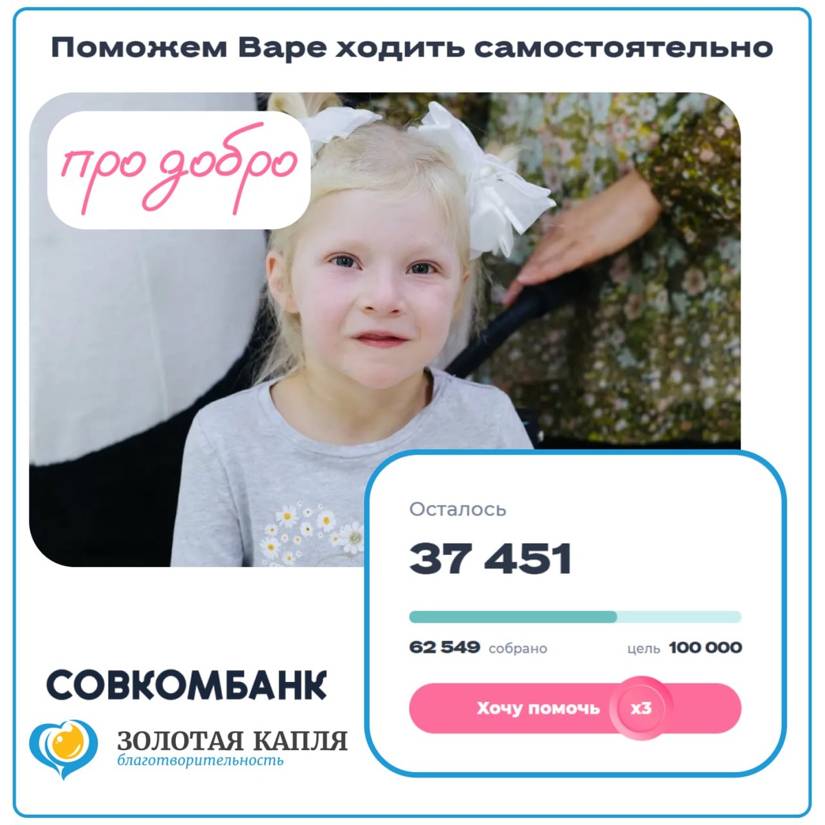 ! ✨ На платформе "продобро" от Совкомбанка открылся сбор для нашей маленькой подопечной - Вари Сенюткиной. Варе 7 лет, и она борется с ДЦП. Каждый день для неё - это маленькое преодоление. Но чтобы закрепить успехи и сделать огромный шаг вперёд, ей нужен специализированный курс реабилитации. Он стоит 100 000 рублей. Осталось собрать 37 451 рубль! Мы верим, что вместе мы сможем закрыть этот сбор быстро! Каждое ваше участие - это капля доброты, которое помогает нашим детям двигаться к своей мечте.💛 Любой может помочь! – Регистрируйтесь, получайте добробаллы за активность или покупки (если вы клиент Совкомбанка) и тратьте их на добрые дела. Совкомбанк умножает вашу помощь! ✨ – Ваши 600 ₽ + 1400 баллов (1 балл = 1 ₽) = 2000 ₽ на помощь Варе! – Не клиент банка? 450 ₽ + ваши первые добробаллы = 1000 ₽!