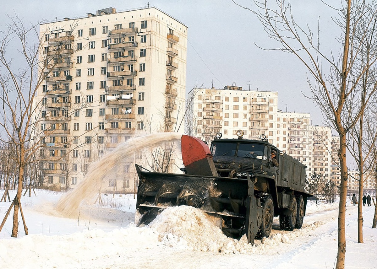 Снежный шторм на Балаклавском проспекте Пока жители спешат по делам, коммунальщики ведут свою «войну со стихией». На передовой — мощный снегоочиститель ДЭ-211 на знаменитом армейском шасси Урал-375Е. Эта машина, созданная Минским заводом «Ударник», не боялась ни снежных заносов, ни гололеда. Фото запечатлело момент ежедневного подвига городских служб, от которых зависела жизнь мегаполиса. 🚩 О жизни в СССР - подписаться 💖 Поддержать канал
