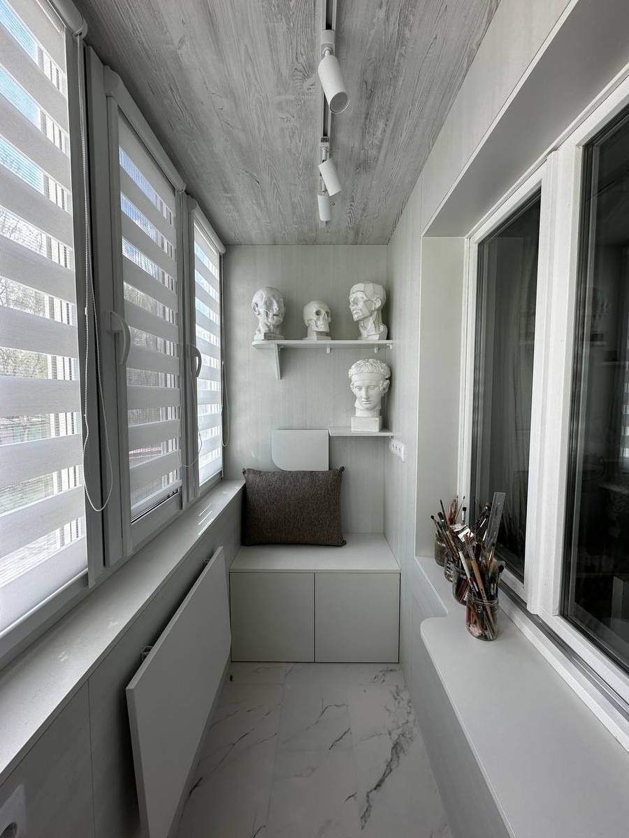 Небольшой балкон может превратиться в полноценную галерею дома и место для вдохновения, если подойти к нему как к выставочному пространству, а не просто к квадратным метрам для сушилки и хлама. В этой статье разберём идею светлого «музейного» балкона: с аккуратной скамьёй, полками с гипсовыми фигурами, удобным подоконником и мягким рассеянным светом. Всё без сложных терминов и ремонтных дебрей, только про красоту, уют и практичность. Белый и светло-серый балкон сразу кажется больше и чище, а вещи на нём выглядят как экспонаты, а не случайный набор предметов. Такой приём часто используют в творческих зонах, чтобы не перегружать пространство и дать глазу отдыхать. На фото как раз такой вариант: мягкий серый потолок «под дерево», светлые стены и пол с мраморным рисунком создают ощущение лёгкой студии, а не лоджии «на всякий случай». Главный герой такого балкона не диван и не стол, а полка. Именно она превращает пространство в маленький музей и задаёт настроение. На компактной белой пол