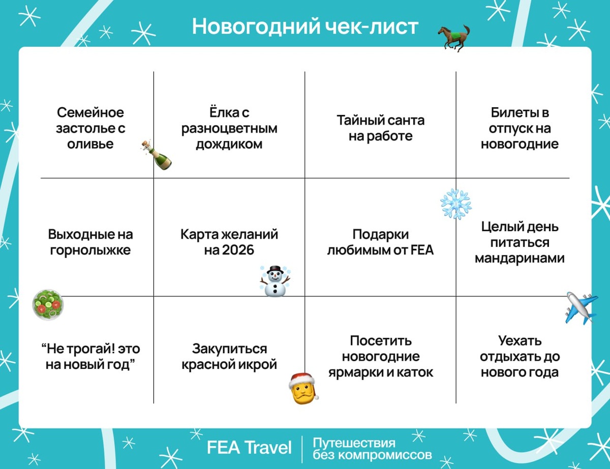 ⭐️ ✨ Отмечайте пункты, которые точно описывают вашу предновогоднюю суету! Уже составили карту желаний на 2026 год? Мы — Да! Верим, что новогодним чудесам суждено сбываться 💖 Путешествия без компромиссов с косметикой FEA Travel